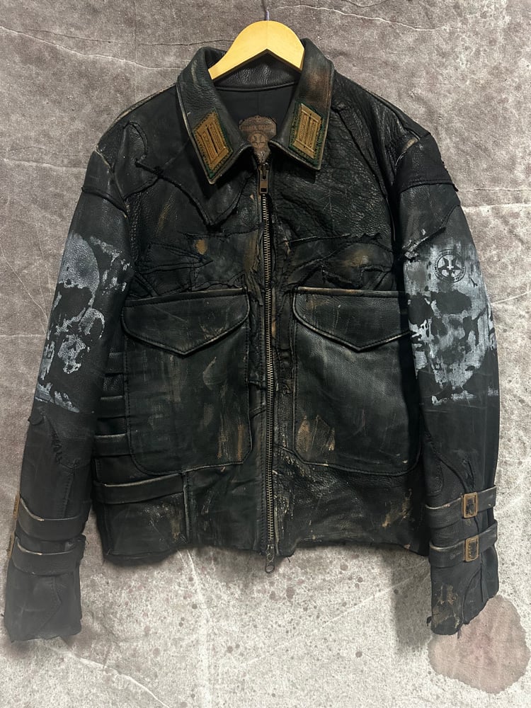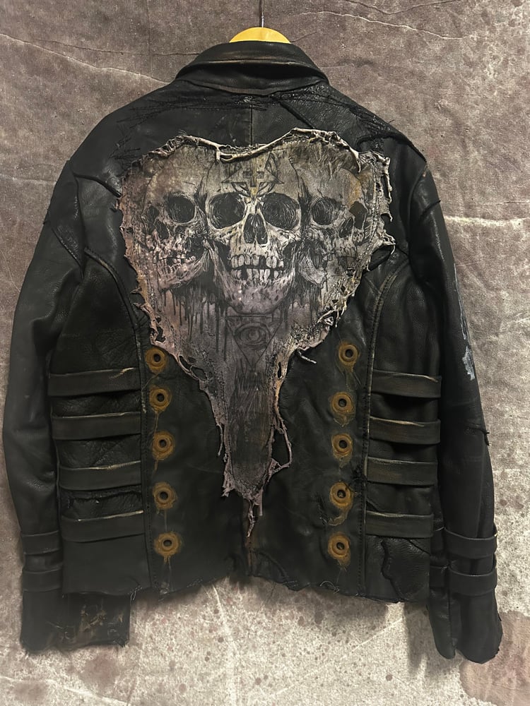 All heavy duty leather distressed and rusted . Featuring vintage collar tabs , Vance Kelly Skull back art, skull sleeve prints and lots of rust . Straps , grommets and buckle details are also present .